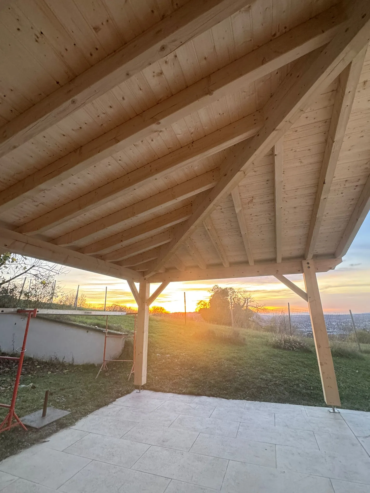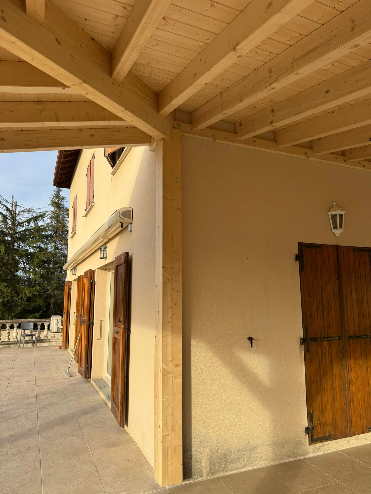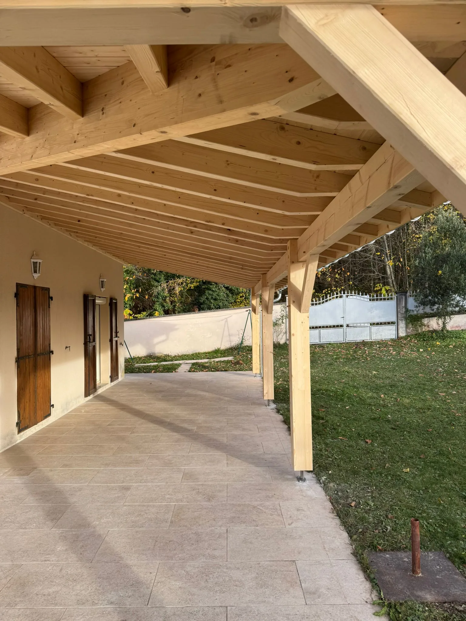 Un auvent en ossature bois réalisé sur-mesure pour abriter la terrasse et profiter de l’extérieur, y compris sous la pluie.