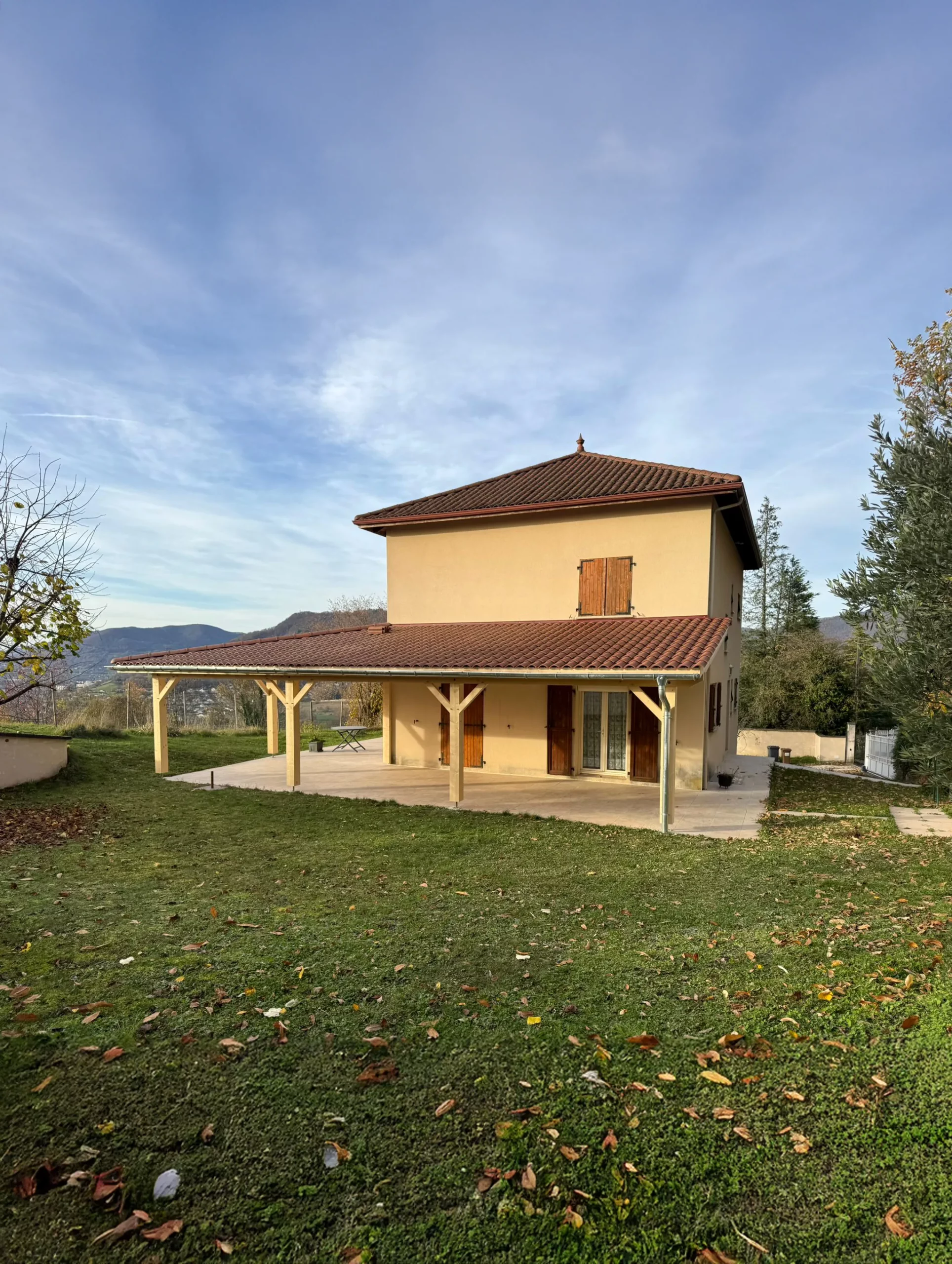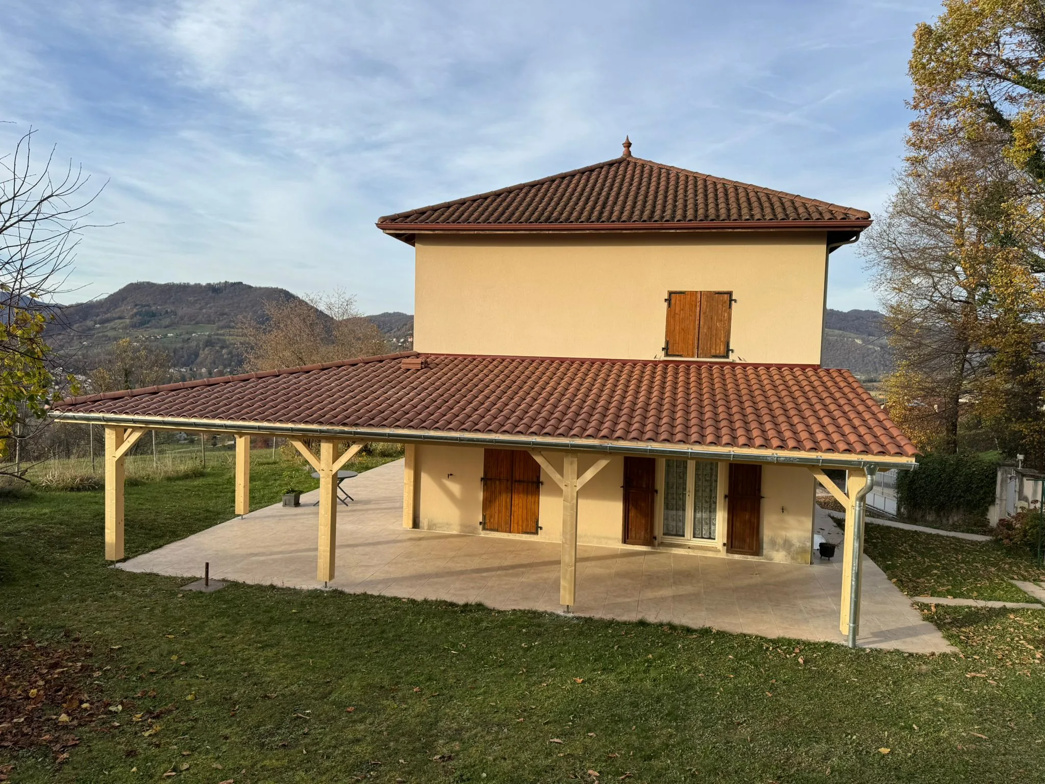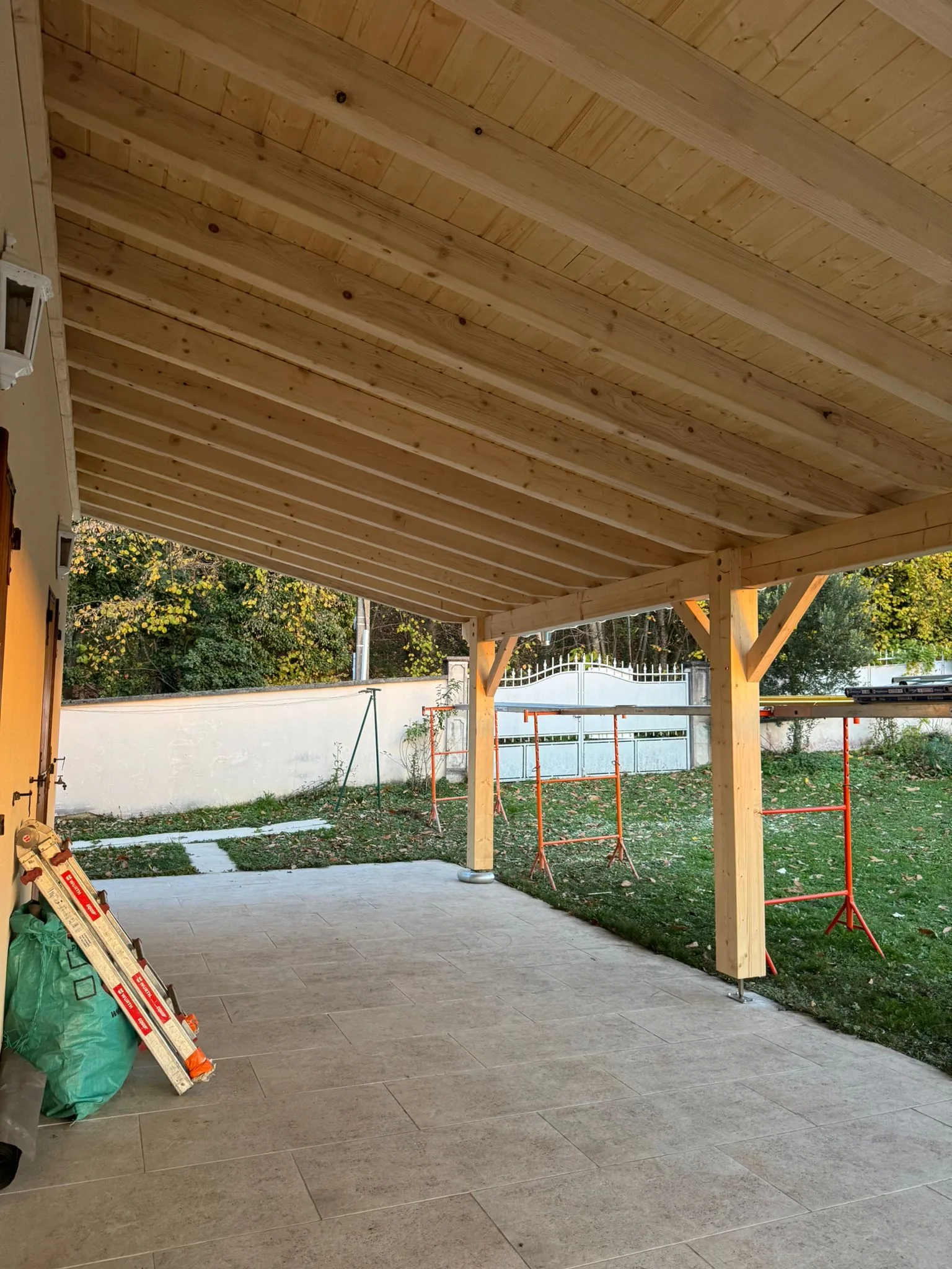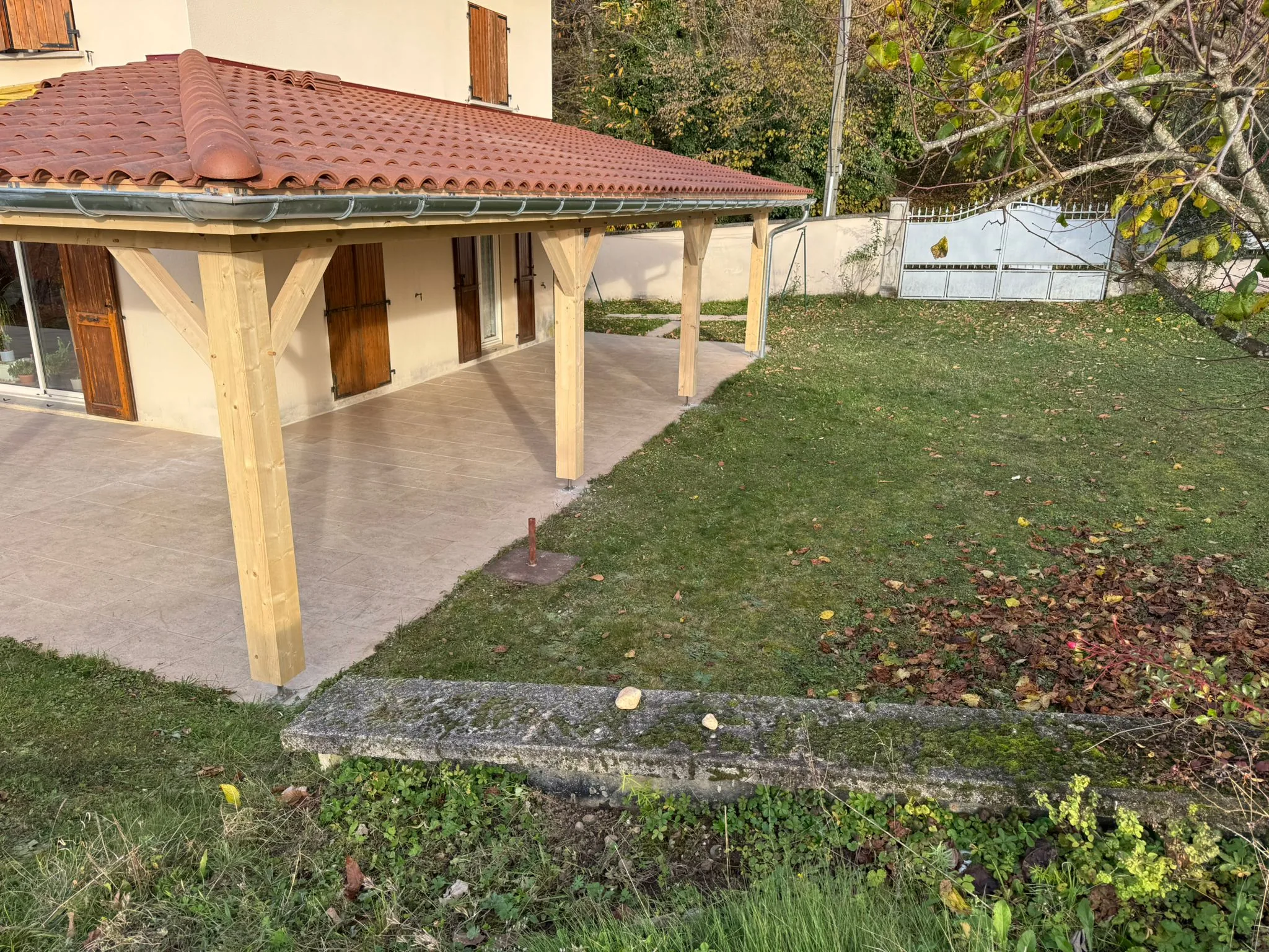 Un auvent en ossature bois réalisé sur-mesure pour abriter la terrasse et profiter de l’extérieur, y compris sous la pluie.